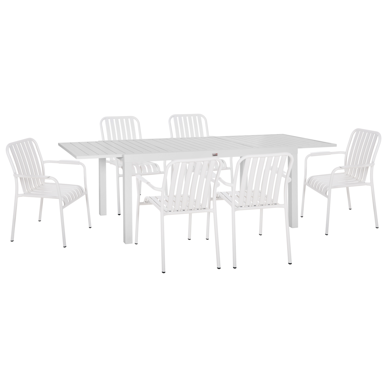Αυτό το σετ τραπεζαρίας εξωτερικού χώρου αποτελείται από ένα ΛΕΥΚΟ επεκτεινόμενο τραπέζι αλουμινίου και 6 ΛΕΥΚΕΣ πολυθρόνες αλουμινίου. Οι πολυθρόνες είναι στοιβαζόμενες.