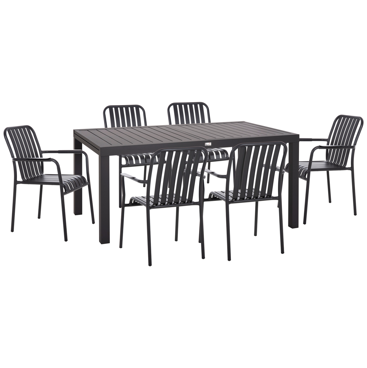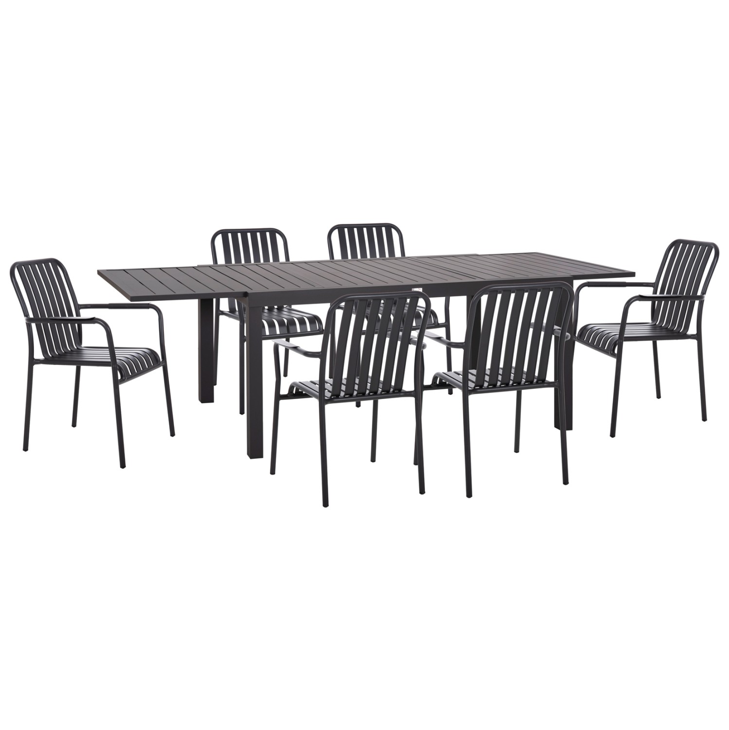 Αυτό το σετ τραπεζαρίας εξωτερικού χώρου αποτελείται από ένα ΣΚΟΥΡΟ ΓΚΡΙ επεκτεινόμενο τραπέζι αλουμινίου και 6 ΣΚΟΥΡΕΣ ΓΚΡΙ πολυθρόνες αλουμινίου. Οι πολυθρόνες είναι στοιβαζόμενες.