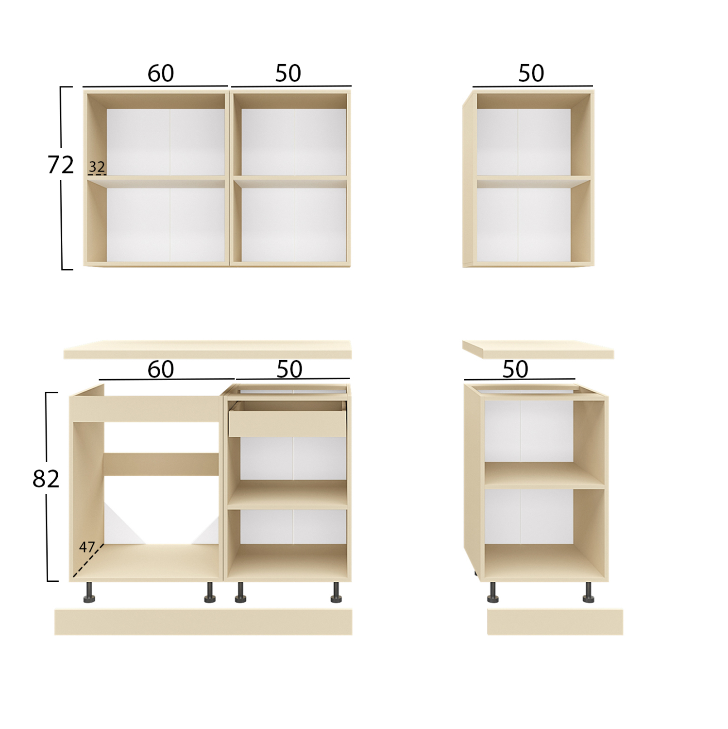 Το κύριο υλικό κατασκευής της κουζίνας είναι η εξαιρετικής ποιότητας μελαμίνη με πάχος 16 χιλιοστά. Η μελαμίνη είναι είδος ξύλου σε μορφή μοριοσανίδας. Οι μοριοσανίδες είναι προϊόντα που έχουν τη μορφή πλάκας (panel). Ως υλικό είναι πολύ ανθεκτικό και με μεγάλη σκληρότητα. Άρα, πρόκειται για ένα συνθετικό υλικό με πολύ σκληρή επιφάνεια, με αποτέλεσμα να είναι πολύ ανθεκτική στις γρατζουνιές, στην τριβή και τους λεκέδες.