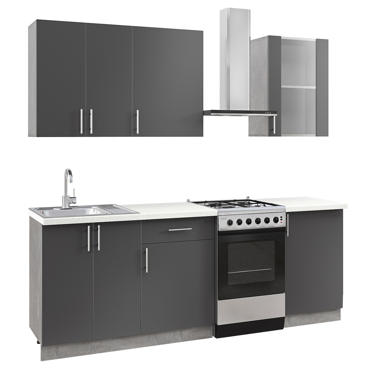 Σύνθεση κουζίνας—-Σας παρουσιάζουμε την καινούργια σειρά με συνθέσεις για την κουζίνα που έχουμε προσθέσει στην γκάμα μας. Αυτή η σύνθεση σε χρώμα ΑΝΘΡΑΚΙ αποτελείται από 1 διπλό, 1 μεγάλο μονό ντουλάπι τοίχου κι ένα ακόμα με γυάλινη πόρτα, ενώ η επιδαπέδια μονάδα αποτελείται από 1 διπλό ντουλάπι κάτω από τον μονό νεροχύτη, ένα συρτάρι κι ένα ντουλάπι από κάτω, κι ένα ακόμα ντουλάπι στην άκρη. Όλες οι πόρτες στα ντουλάπια έχουν μοντέρνα ΙΝΟΧ χερούλια. Οι πάγκοι της σύνθεσης έχουν χρώμα και όψη λευκού μαρμάρου και δημιουργούν μια έντονη διχρωμία, ενώ το υλικό κατασκευής τους σας επιτρέπει να τους χρησιμοποιείτε με άνεση γιατί είναι ανθεκτικοί σε διάφορα είδη καταπόνησης.
