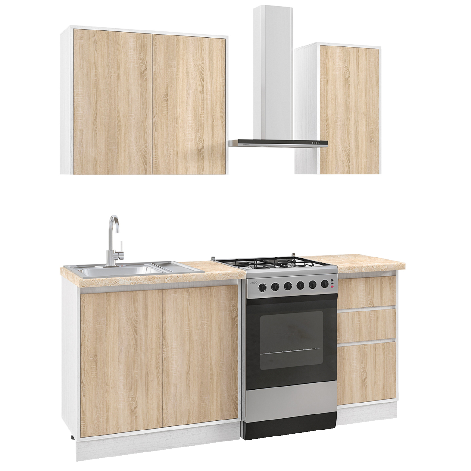 Σύνθεση κουζίνας—-Σας παρουσιάζουμε την καινούργια σειρά με συνθέσεις για την κουζίνα που έχουμε προσθέσει στην γκάμα μας. Αυτή η σύνθεση μελαμίνης σε χρώμα ανοιχτού SONOMA και πλαινα και μπαζα σε λευκό, αποτελείται από 1 μεγάλο διπλό και 1 μονό ντουλάπι τοίχου ενώ η επιδαπέδια μονάδα αποτελείται από 1 μεγάλο διπλό ντουλάπι κάτω από τον μονό νεροχύτη, και μια συρταριέρα με 3 συρτάρια στην γωνία. Οι πάγκοι της σύνθεσης έχουν χρώμα μπεζ μαρμάρου και δημιουργούν την αίσθηση της μονοχρωμίας που δίνει μια ομοιόμορφη όψη στην κουζίνα σας, ενώ το υλικό κατασκευής τους σας επιτρέπει να τους χρησιμοποιείτε με άνεση γιατί είναι ανθεκτικοί σε διάφορα είδη καταπόνησης.