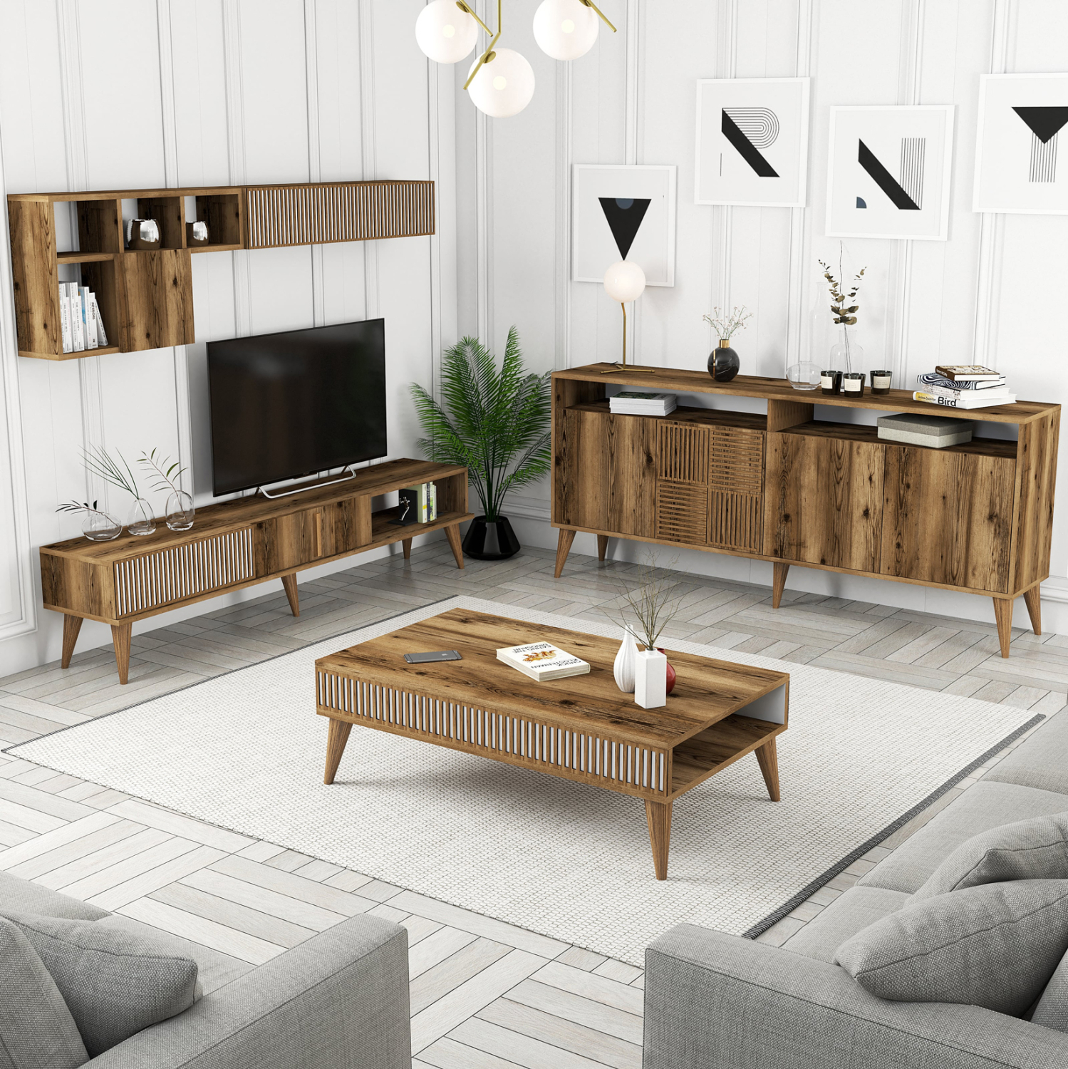 Η σύνθεση ΗΜ11845.01 θα αλλάξει την όψη στο σαλόνι σας και θα σας προσφέρει την αναβάθμιση που θέλετε. Αποτελείται από έναν συνδυασμό επίπλων για την τηλεόρασή σας με μονάδα δαπέδου και επιτοίχια ράφια, ένα τραπεζάκι σαλονιού, και έναν μπουφέ. Όλη η σύνθεση είναι της ίδιας σειράς και τα κυρίαρχα χρώματα είναι το ΚΑΡΥΔΙ και το ΛΕΥΚΟ.