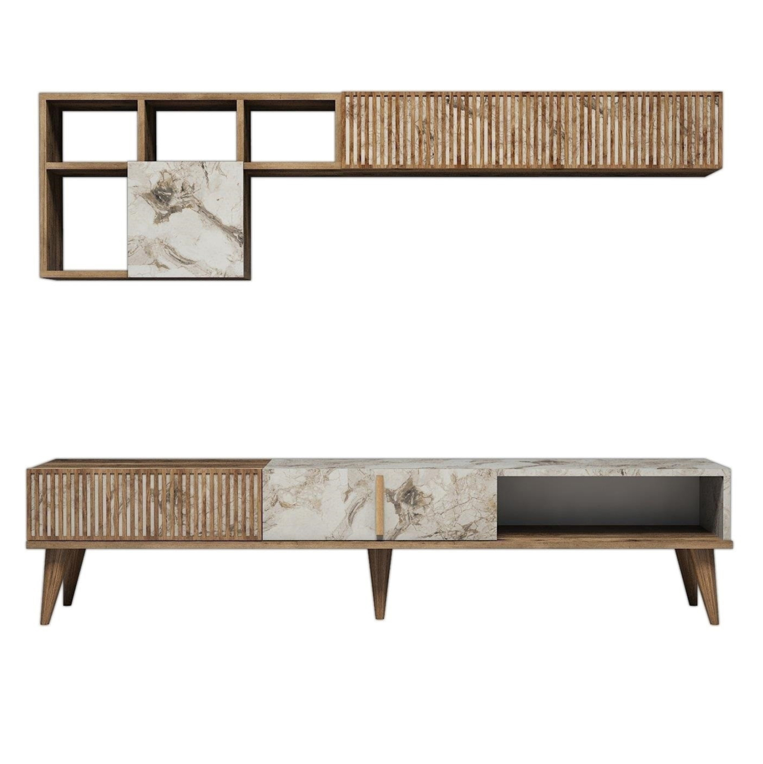 Το ΗΜ9438.01 είναι ένα μοντέρνο και λειτουργικό έπιπλο τηλεόρασης, που θα ομορφύνει το σαλόνι σας! Είναι μακρύ και διαθέτει 2 ντουλάπια με ενιαίο χώρο στην αριστερή πλευρά της κύριας μονάδας δαπέδου που ανοίγουν προς τα κάτω και έναν ανοιχτό χώρο αποθήκευσης στην δεξιά πλευρά. Η σύνθεση ολοκληρώνεται με επιτοίχια ράφια και ντουλάπια που δίνουν άπλετο χώρο είτε για την διακόσμηση σας, είτε για αποθήκευση αντικειμένων. Διαθέτει 4 πόδια στην μονάδα δαπέδου και ένα επιπλέον στο κέντρο για μεγαλύτερη στιβαρότητα, ενώ το έπιπλο έρχεται σε μια πανέμορφη διχρωμία καρυδί με λευκό μαρμαρο, και οι διαστάσεις του είναι κατάλληλες για όλες τις τηλεοράσεις εάν θέλετε η τηλεόρασή σας να στηρίζεται σε βάση. Πρόκειται για μια κομψή και ολοκληρωμένη πρόταση για το σαλόνι σας!