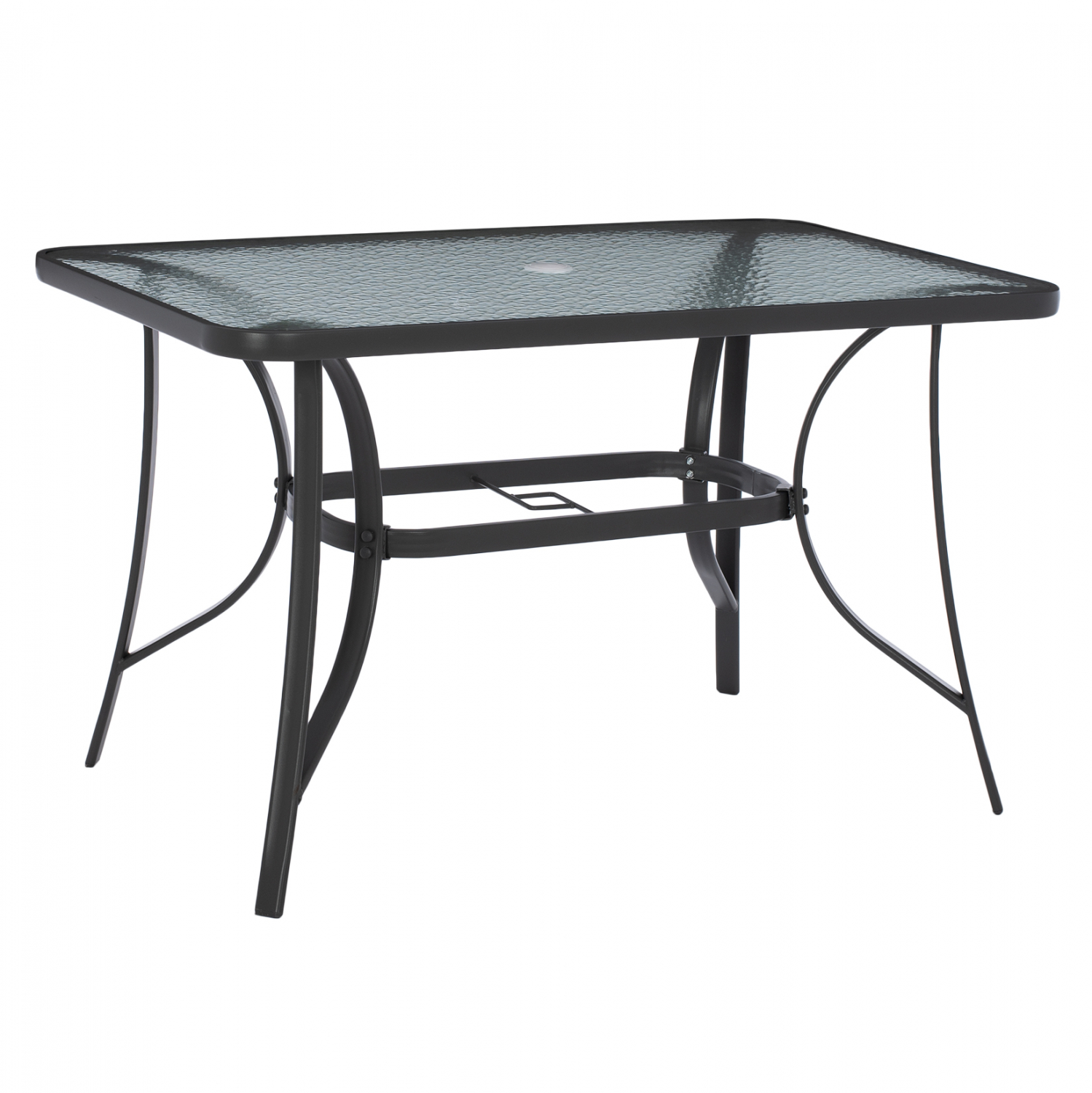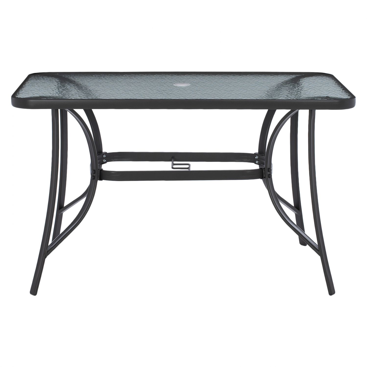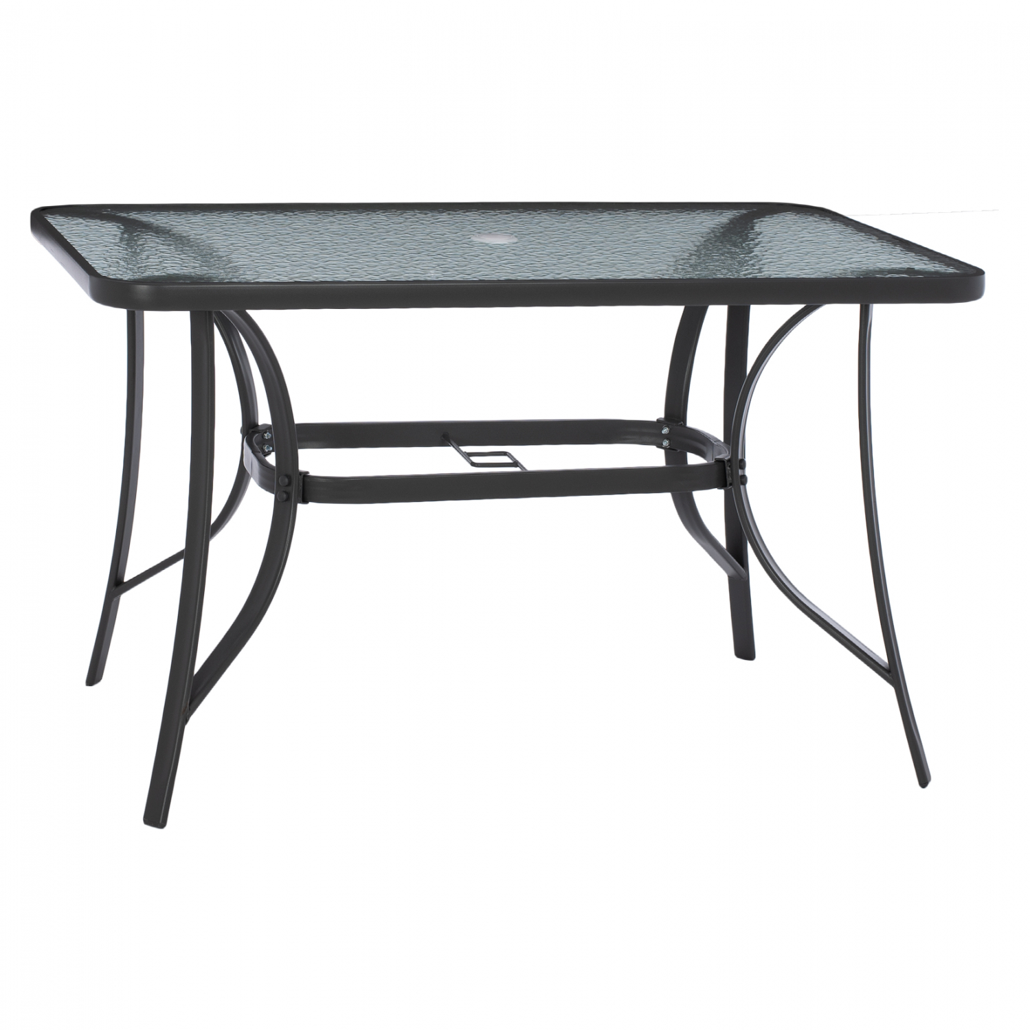 ΗΜ5021.11 Τραπέζι BRAVO εξωτερικού χώρου με ΓΚΡΙ μεταλλικό σκελετό και γυάλινη θολή επιφάνεια! Πρόκειται για πολύ δημοφιλές τραπέζι που δεν λείπει σχεδόν από κανέναν μπαλκόνι ή κήπο. Το BRAVO μάλιστα έρχεται και με τρύπα στο κέντρο για τοποθέτηση ομπρέλας. Είναι ορθογώνιο με γωνίες στρογγυλεμένες ενώ το γυαλί της επιφάνειας είναι ενισχυμένο.