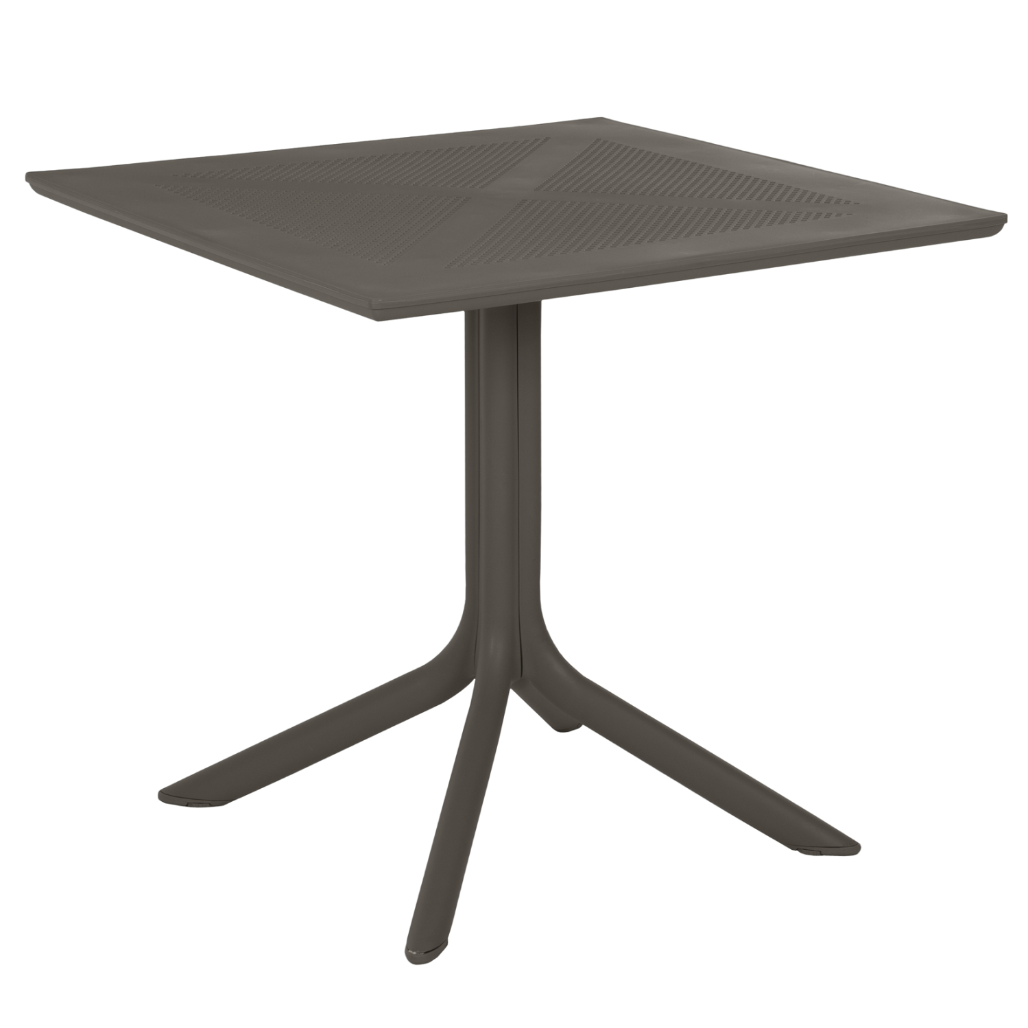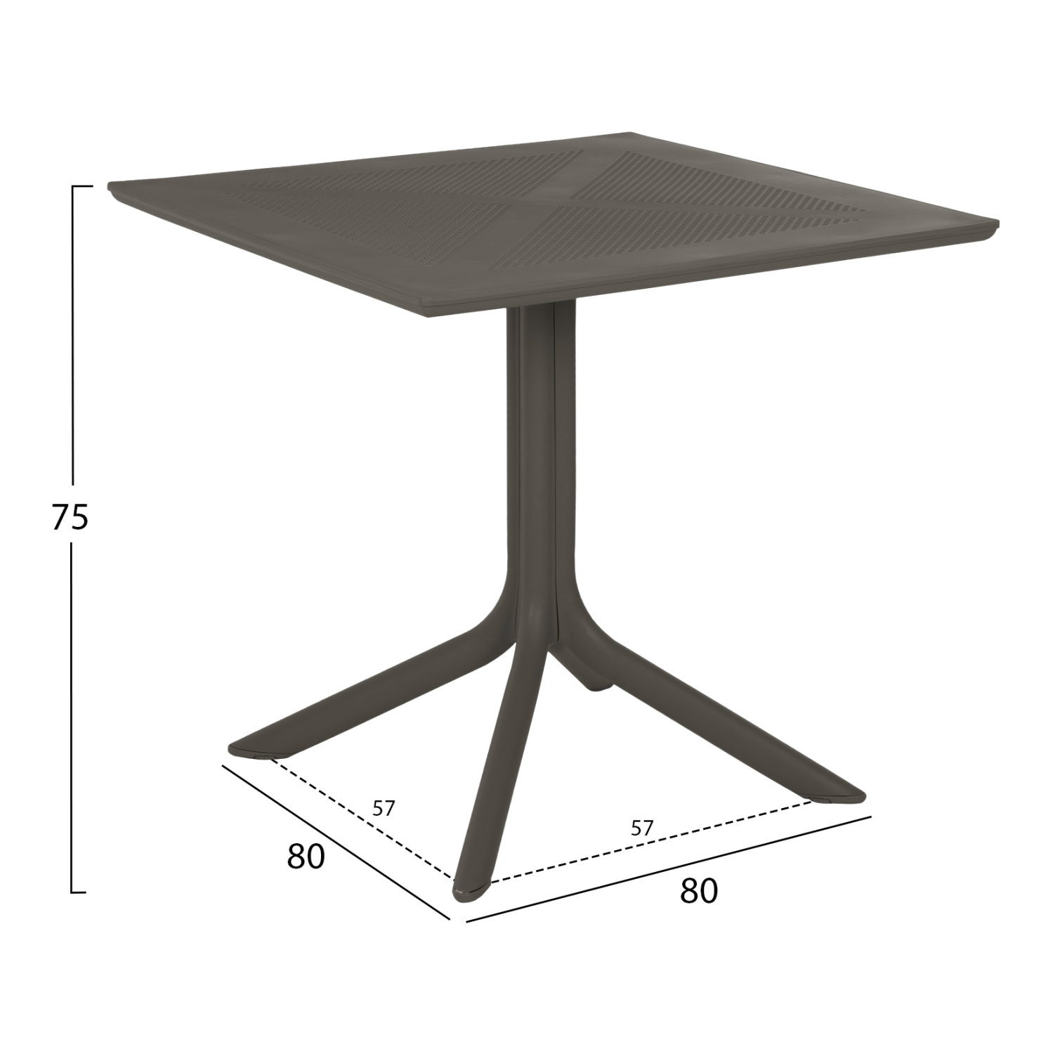 Τραπέζι πολυπροπυλενίου σε DARK OLIVE χρώμα. Ιδανική πρόταση για χρήση σε εξωτερικούς χώρους, είτε επαγγελματικούς (χώροι δεξιώσεων, εταιρείες catering, κλπ.) είτε για το σπίτι. Το τραπέζι αποτελείται από μια «τρυπητή» τετράγωνη επιφάνεια, ενώ η στήριξη γίνεται με μια κολώνα στο κέντρο που καταλήγει σε 4 πόδια («νύχια»).