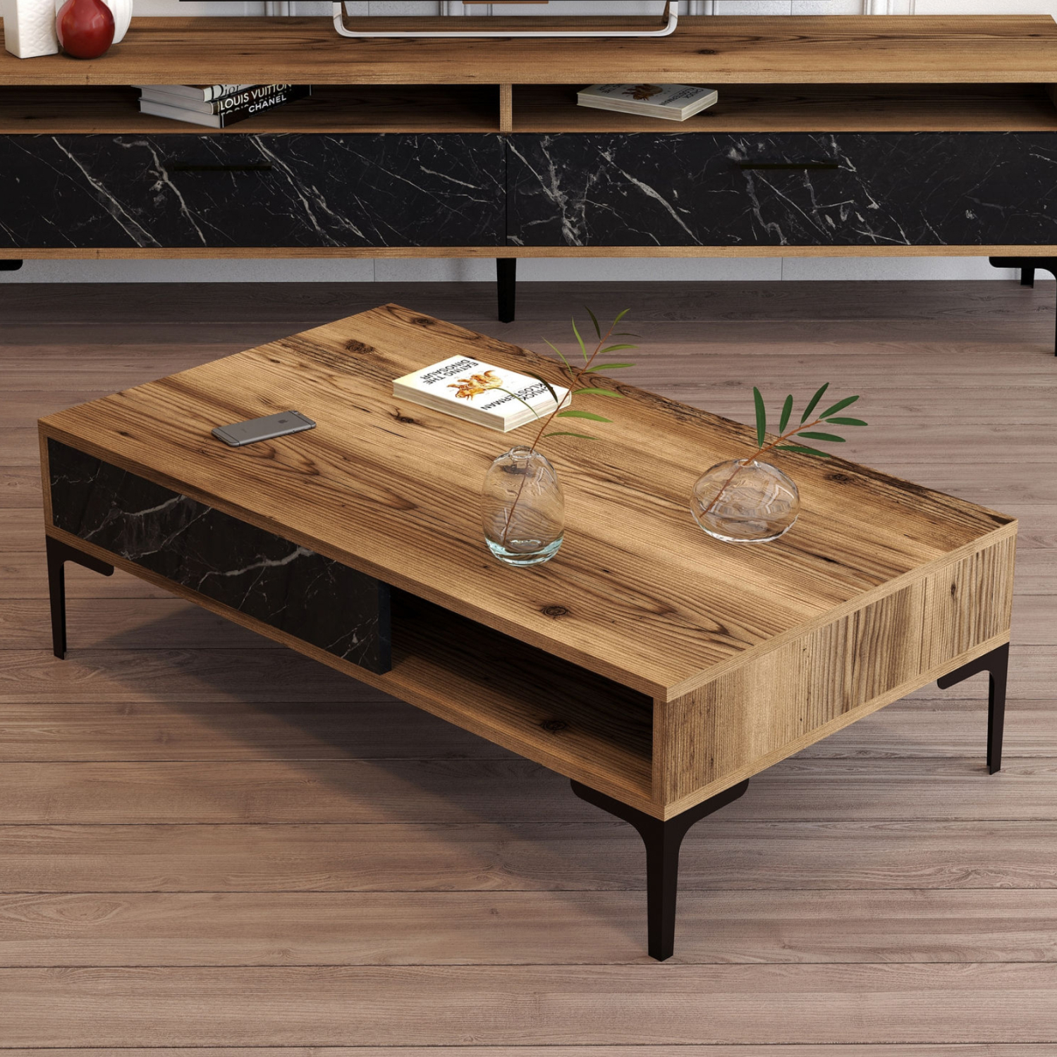 ΗΜ9503.04 τραπεζάκι σαλονιού—– Το τραπεζάκι αυτό είναι ένα όμορφο έπιπλο σε χρώμα καρυδί με πλαϊνό σε ΟΨΗ ΜΑΥΡΟΥ ΜΑΡΜΑΡΟΥ. Το πρακτικό του design θα αλλάξει την εικόνα του σαλονιού ή του καθιστικού σας προς το καλύτερο. Πρόκειται για μια κατασκευή με μια ικανοποιητικού μεγέθους επάνω επιφάνεια. Από κάτω υπάρχει ανοιχτός χώρος τοποθέτησης αντικειμένων κατά το ήμισυ. Η κομψότητα, η ποιότητα και το minimal πρακτικό design χαρακτηρίζουν αυτό το τραπεζάκι, που έχει φτιαχτεί για εσένα.