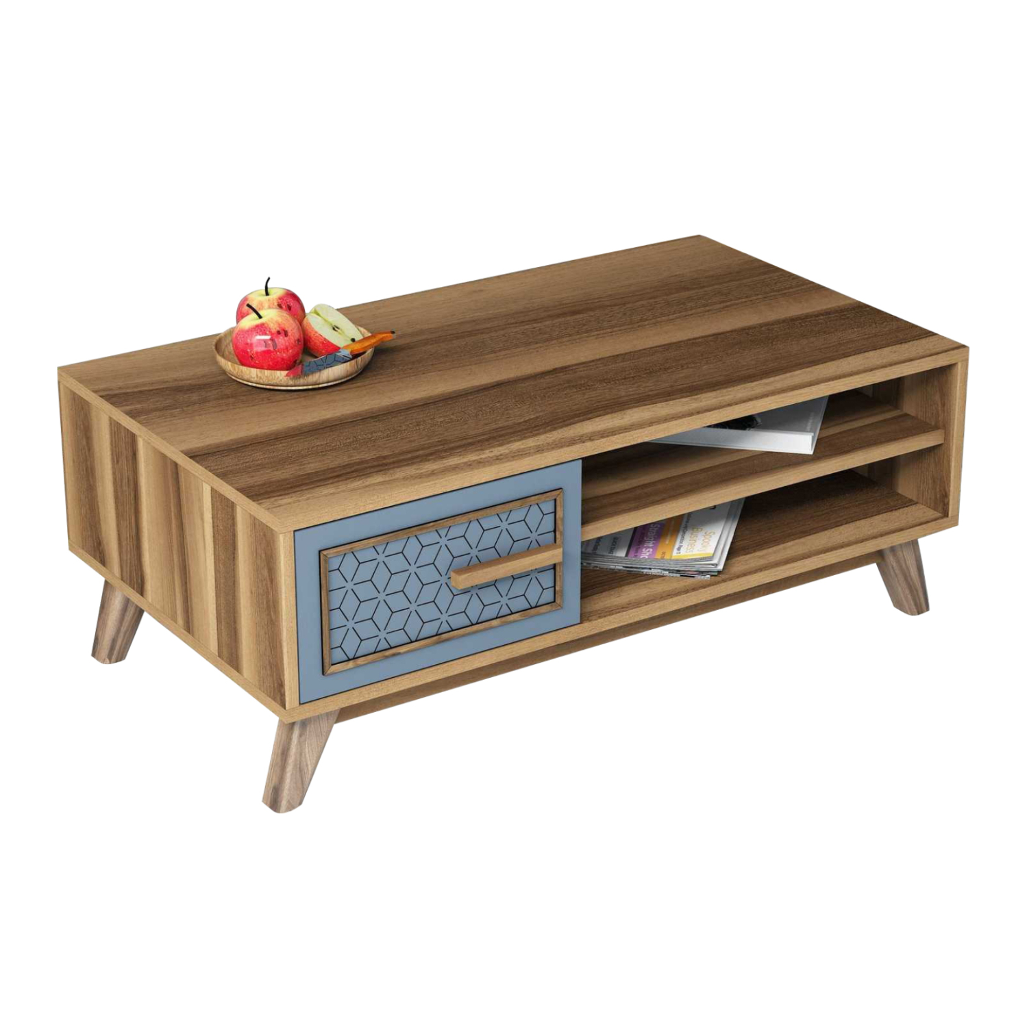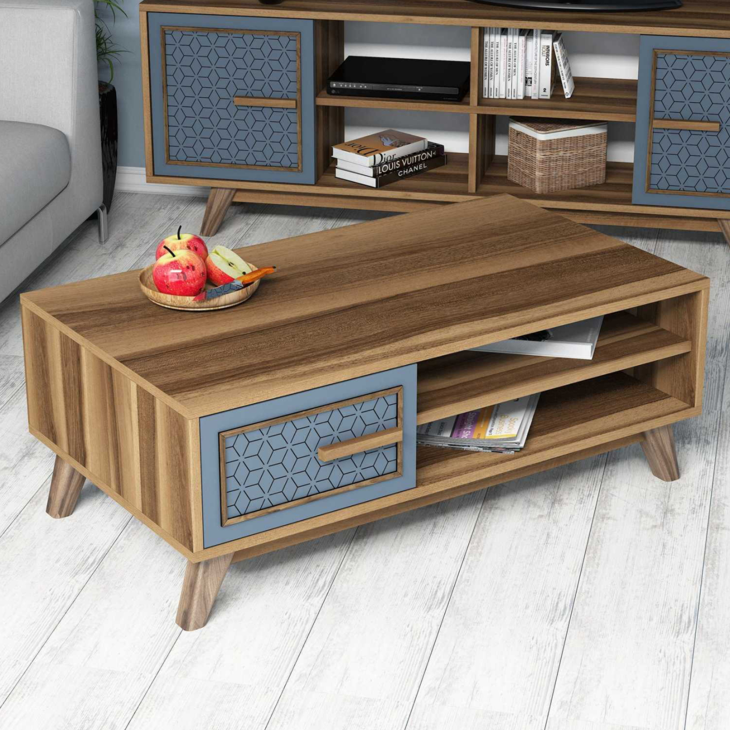 ΗΜ9497.02 τραπεζάκι σαλονιού—– Το τραπεζάκι αυτό είναι ένα πανέμορφο έπιπλο σε χρώμα καρυδί. Το πρακτικό του design θα αλλάξει την εικόνα του σαλονιού ή του καθιστικού σας προς το καλύτερο. Πρόκειται για μια κατασκευή με μια ικανοποιητικού μεγέθους επάνω επιφάνεια. Από κάτω υπάρχουν δύο ράφια και ένας ακόμα αποθηκευτικός χώρος με πορτάκι σε ΜΠΛΕ χρώμα. Η κομψότητα, η ποιότητα και το minimal πρακτικό design, είναι κάποια χαρακτηριστικά από το τραπέζι σαλονιού, που έχει φτιαχτεί για εσένα.