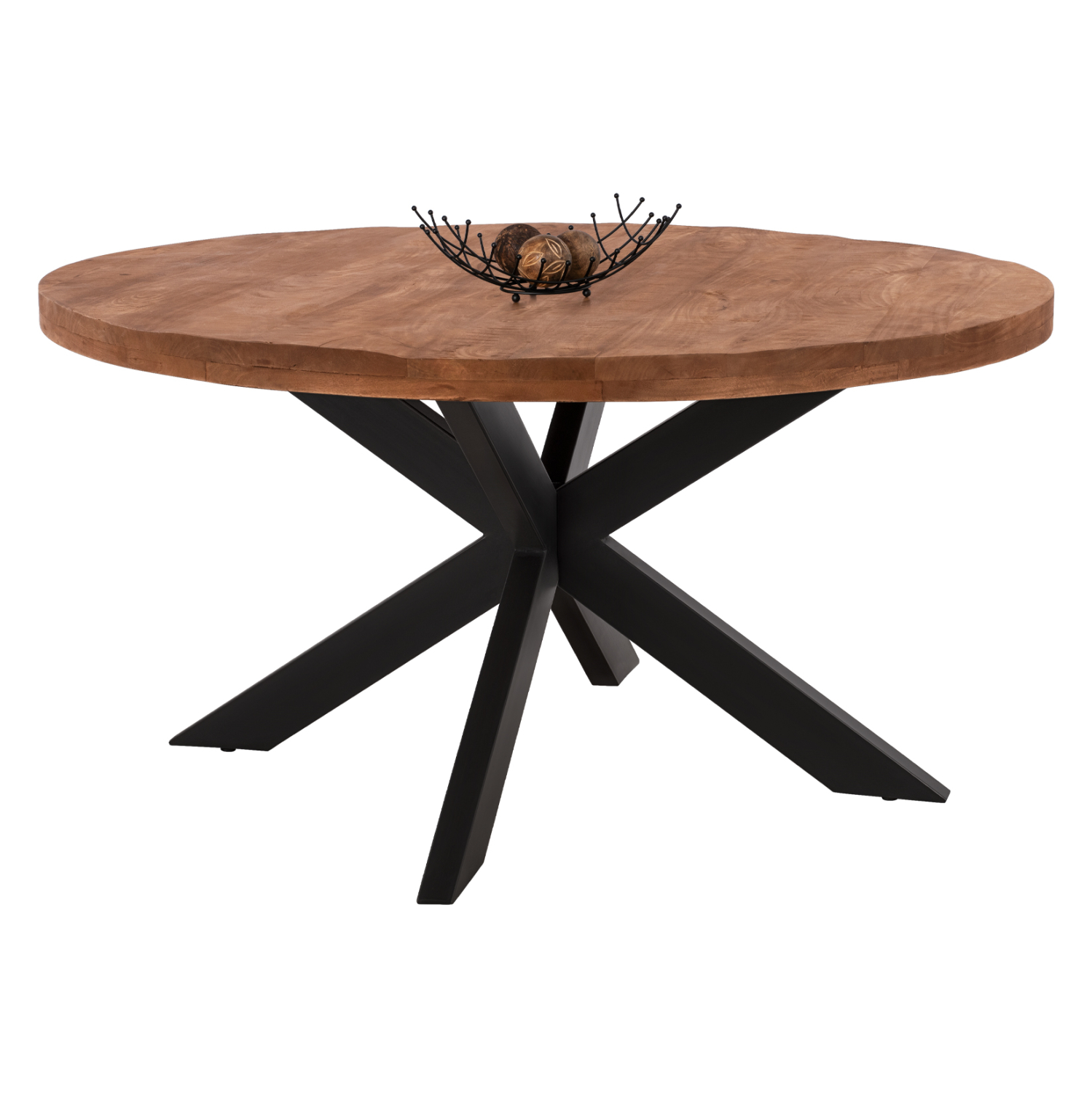 Ανακαλύψτε το μοναδικό χειροποίητο τραπέζι HM8485.11 με επιφάνεια από φυσικό μασίφ ξύλο MANGO. To σχήμα είναι στρογγυλό (ροτόντα) και στηρίζεται σε μαύρα μεταλλικά πόδια σε διάταξη διπλού χιαστί.