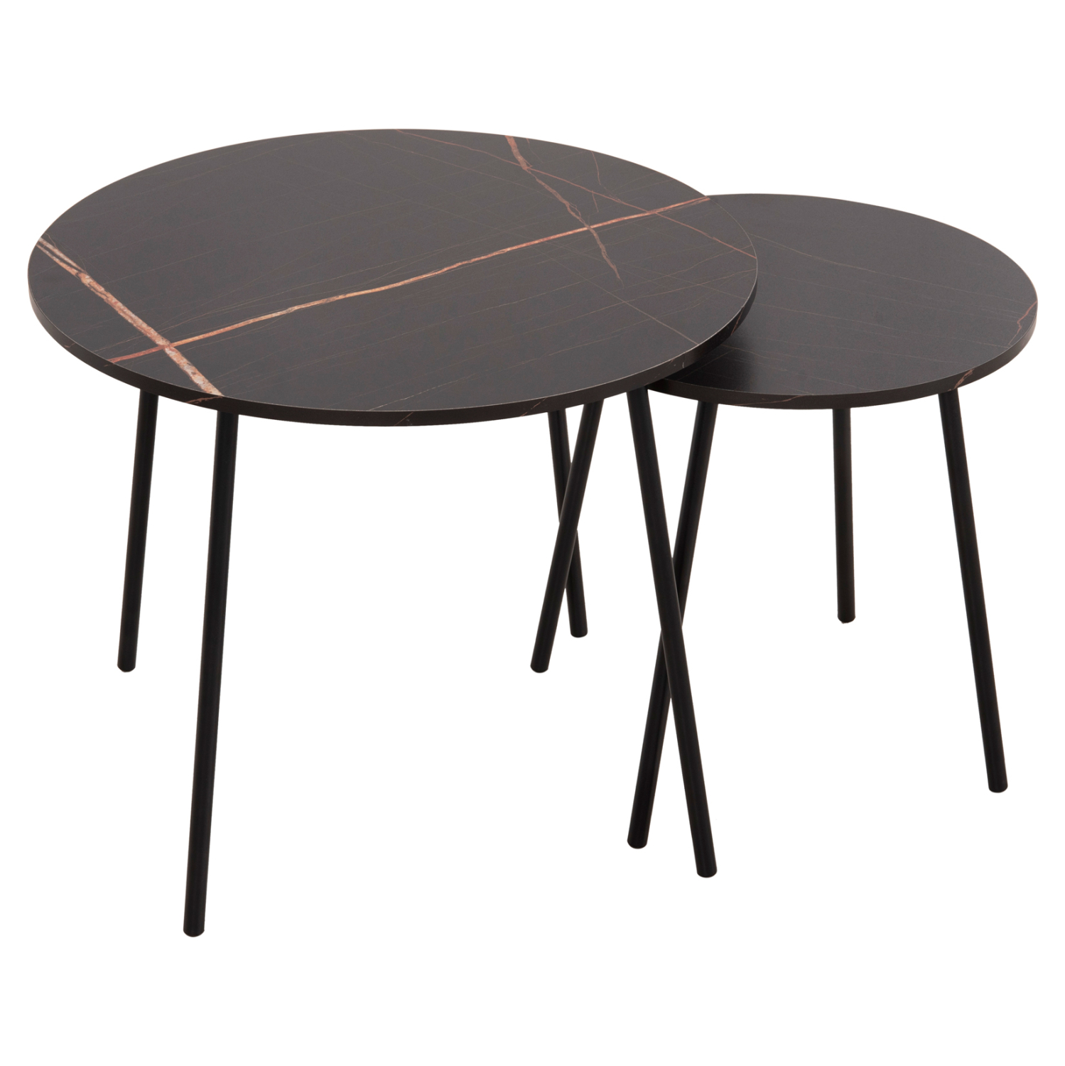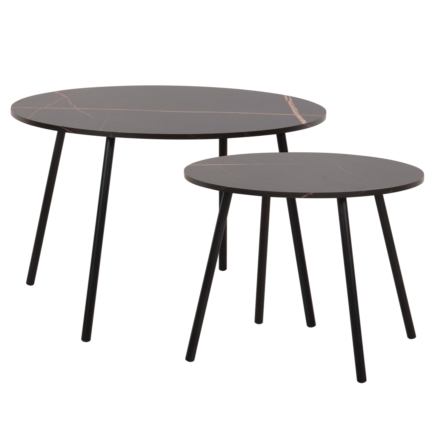 Τα τραπεζάκια ζιγκόν CUPPER θα σας ενθουσιάσουν με το στυλ και την πρακτικότητά τους. Μπορείτε να δημιουργήσετε πρωτότυπες διακοσμητικές συνθέσεις, δίνοντας νέα πνοή στον χώρο σας με αυτό το σετ. Πρόκειται για 2 στρογγυλά τραπέζια, ένα ψηλότερο κι ένα πιο κοντό που αποθηκεύεται κάτω από το ψηλό. Τα πόδια είναι μεταλλικά σε μαύρο χρώμα, ενώ οι επιφάνειές τους είναι σε χρώμα ΜΑΥΡΟ ΜΑΡΜΑΡΟ.
